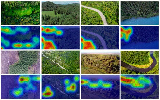 Visual Interpretation of Attention Maps from ForestIQNet. The figure presents UAV forest scenes (top and third rows) alongside their corresponding attention maps (second and fourth rows), generated by the ForestIQNet model. Warmer regions in the heatmaps indicate areas of high model focus during biomass prediction, highlighting dense canopy regions and complex structural features that strongly influence the estimation.