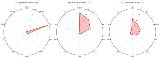 Radar plots illustrate the relative importance of individual input features in predicting AGB across three categories: vegetation indices (a), texture features (b), and their combination (c). In subplot (a), the Triangular Vegetation Index (TVI) clearly dominates, contributing the highest importance score among all VIs, highlighting its sensitivity to canopy density and chlorophyll concentration. Subplot (b) reveals that the contrast metric is the most influential among the texture features, followed closely by correlation and variance, reflecting the significance of spatial heterogeneity in forest structure. When all features are combined in subplot (c), the importance becomes more distributed, but TVI, DVI, contrast, and correlation still retain a leading role. This integrated view emphasizes the complementary strengths of spectral and structural indicators, reinforcing the benefit of multimodal data fusion in forest biomass estimation.