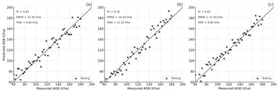 In each subplot in Figure 6, the predicted AGB values are plotted against the measured ground truth, with the dashed line representing perfect agreement. Panel (a) reflects the full version of the model, which uses all available input data—including RGB, NIR, Red Edge, and CHM—and achieves the strongest performance, with an R2 of 0.83 and the lowest error rates. In panel (b), where only spectral inputs were used, the model accuracy drops slightly (R2 = 0.76), suggesting that structural information plays a key role in improving predictions. Panel (c) shows results from a variant using lower-resolution structural data; even with this limitation, the model maintains strong performance (R2 = 0.81), indicating its robustness. Overall, these results highlight the value of combining spectral richness with structural detail when estimating forest biomass. ForestIQNet was further evaluated on forest types that were entirely excluded from the training phase, including ecologically distinct species such as Pinus koraiensis and Quercus mongolica. In this zero-shot testing scenario, the model achieved an R2 of 0.88 on coniferous forests and 0.85 on mixed hardwood stands. These results highlight ForestIQNet’s strong generalization capability across taxonomically and structurally diverse vegetation types. This level of performance affirms the model robustness and adaptability, reinforcing its potential as a scalable solution for high-resolution forest carbon accounting in ecologically heterogeneous landscapes.