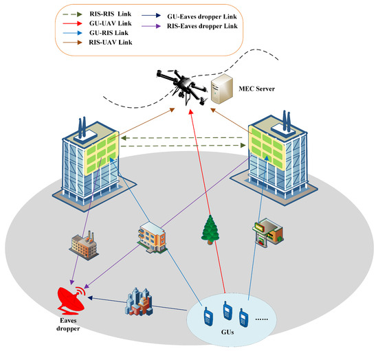 In the transition toward sixth-generation (6G) wireless networks, the rapid expansion of smart devices and large-scale Internet of Things (IoT) applications (e.g., smart cities, industrial monitoring, and real-time video analytics) has led to a massive surge in data traffic, along with growing demands for low-latency computation and reliable communication in complex environments [1,2]. To address these challenges, unmanned aerial vehicle–mobile edge computing (UAV-MEC) systems have emerged as a promising technology, drawing significant attention for their ability to leverage UAVs’ mobility and flexible deployment to extend edge computing capabilities into scenarios where ground infrastructure is sparse or overloaded [3,4]. As aerial edge nodes, UAVs can dynamically establish communication links to handle the computation offloading needs of ground users (GUs), providing a viable solution to reduce delays caused by long-distance data transmission to central clouds [5]. However, in dense urban environments, obstacles such as buildings and signal attenuation often destabilize direct communication links between UAVs and GUs—increasing transmission energy consumption—while the broadcast nature of wireless signals makes task data vulnerable to interception by eavesdroppers, posing threats to physical layer security [6,7]. These combined challenges underscore the critical need for innovative technological solutions to enhance the communication reliability and security of UAV-MEC systems.