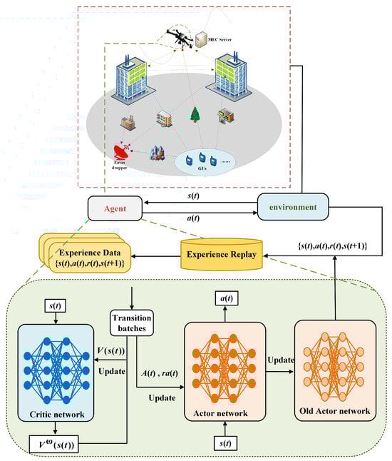 PPO is based on the trust region policy optimization algorithm, which introduces a clipping factor into the objective function to stabilize the magnitude of action updates within a proximal range; as an on-policy algorithm, it requires less cache space during training and features faster training speed, thus being more suitable for small edge nodes such as UAVs, with its training framework illustrated in Figure 2. During the training process, the agent continuously interacts with the environment to acquire experiential information; after an episode concludes, it retrieves a new batch of collected experiential information from the experience buffer to update its policy, where for each update, the Actor network and Critic network utilize the policy loss function and the state-value loss function as their respective objectives. The loss function of the Actor network is as follows: