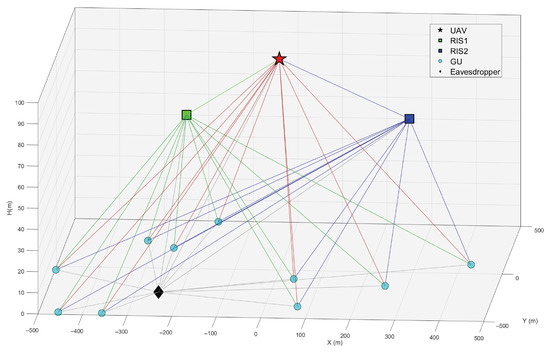 We evaluate the proposed algorithm from the perspectives of average queue backlog and average total secure energy efficiency through extensive numerical experiments. A schematic diagram of the simulated 3D scenario is illustrated in Figure 3. The scenario involves a UAV, two collaborative RISs (RIS1 and RIS2), 10 GUs randomly distributed within a 3D area of 1000 × 1000 m2, and a single-antenna eavesdropper located at . The set of all GUs is denoted as . Specifically, RIS1 is deployed at coordinates and RIS2 at , with a consistent deployment height of m for both RISs. The UAV is equipped with a uniform rectangular array (URA) antenna, having an initial position of and a maximum speed of m/s. Both RIS1 and RIS2 adopt a 20 × 20 array structure, consisting of and passive reflecting elements, respectively. The entire mission duration T is discretized into equal time slots, each with a duration of s. Key simulation parameters are summarized in Table 1.