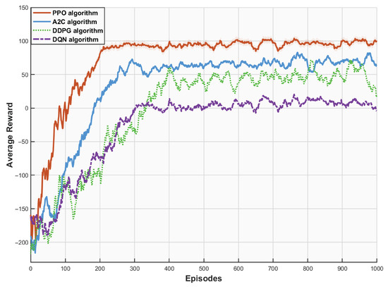 Figure 4 shows a comparison of convergence curves of different DRL algorithms in the scenario with 10 users (K = 10), where the vertical axis represents the average cumulative reward per episode and the horizontal axis represents the number of training steps. The experimental results indicate that as training progresses, the average cumulative reward per episode of all four algorithms shows an upward trend, demonstrating that DRL methods can optimize strategies through continuous learning, enabling the system performance to gradually improve and stabilize. Specifically, the proposed PPO algorithm exhibits the optimal performance: its convergence speed is significantly faster than that of the Advantage Actor–Critic (A2C) and Deep Deterministic Policy Gradient (DDPG) algorithms, showing a rapid upward trend in the early stage of training, entering a stable phase in advance, and ultimately achieving the highest cumulative reward value. In contrast, the DDPG algorithm has the most significant reward fluctuations and a slower convergence speed, mainly due to its deterministic action output mechanism, which leads to insufficient stability in the policy gradient update direction and limits its exploration ability in continuous action spaces. The Deep Q-Network (DQN) algorithm, which is natively suitable for discrete action spaces, performs the worst in the continuous resource allocation optimization problem involved in this experiment; it not only converges slowly but also achieves the lowest cumulative reward value after stabilization, further verifying its limitations in continuous action space scenarios. These experimental results fully prove that the PPO algorithm, relying on its clipping mechanism for policy updates and efficient sample utilization, exhibits better convergence stability and strategy optimization capabilities than the other three DRL algorithms in complex continuous action space optimization problems, providing a reliable solution for the model proposed in this paper.