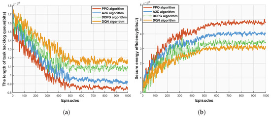 Performance comparison of DRL algorithms in terms of task queue length and secure energy efficiency. (a) Queue length of different DRL algorithms. (b) Secure EE of different DRL algorithms.