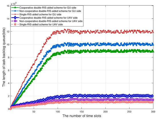 Figure 6 compares the queue stability performance of the UAV-MEC system under different RIS assistance schemes, where the vertical axis represents the queue length and the horizontal axis represents the number of time slots. The experimental results show that the user queue length is significantly longer than the UAV queue length, mainly because the UAV has stronger computing processing capabilities and higher task processing efficiency, resulting in a smaller queue backlog. In terms of the time evolution trend, as the number of time slots increases, the user queues of all schemes exhibit a characteristic of “rapid growth–slow growth–stabilization”, while the UAV queues show a trend of “gradual growth–stabilization”. In the initial stage, limited by channel conditions, the efficiency of user task offloading is low, leading to rapid accumulation of queues; as the system operation enters a stable period, the amount of task generation reaches a dynamic balance with the amount of local and edge processing, and the queue length maintains stable fluctuations. The performance differences between different RIS assistance schemes are particularly significant: the double-RIS cooperative scheme has the shortest user queue length and the longest UAV queue length, which benefits from the higher channel gain generated by the cooperative reflection of multiple RISs, enabling more user tasks to be efficiently offloaded to the UAV and significantly reducing the backlog at the user end; the double-RIS non-cooperative scheme, which does not utilize the cooperative gain between RISs, has a slightly longer user queue length than the cooperative scheme, and the UAV queue is correspondingly shorter; the single-RIS scheme, due to the lowest channel gain and limited task offloading capability, results in the longest user queue length and the shortest UAV queue length. These results indicate that the RIS cooperation mechanism directly affects the task offloading strategy by improving channel quality, thereby exerting a significant regulatory effect on queue stability, verifying the advantage of multi-RIS cooperation in balancing the loads of users and the UAV.