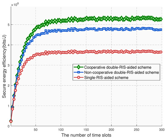 Figure 7 presents the dynamic variation trend of the system’s secure EE under different RIS assistance schemes, where the vertical axis represents the secure EE value and the horizontal axis represents the number of time slots. The experimental results show that the system’s secure EE exhibits an evolutionary characteristic of “initial fluctuation–gradual improvement–stabilization” during operation: in the initial stage, limited by channel conditions, the system’s secure EE is at a relatively high level; as the time slots progress, the secure EE gradually improves and finally remains within a stable range, which is closely related to the optimization of transmission efficiency after the channel gain stabilizes. There are significant differences in the secure EE performance among different RIS assistance schemes: the system’s secure EE increases in turn from the single-RIS scheme to the double-RIS non-cooperative scheme to the double-RIS cooperative scheme. Specifically, the double-RIS cooperative scheme, relying on the collaborative reflection effect of multiple RIS units, can maximize the channel gain, reduce transmission energy consumption while increasing the amount of secure task transmission, thus achieving the highest secure EE; the double-RIS non-cooperative scheme, which does not fully utilize the cooperative gain between RISs, has a slightly lower secure EE than the cooperative scheme; the single-RIS scheme, due to limited channel gain and low secure transmission efficiency, shows the worst performance in terms of secure EE. These results verify that the multi-RIS cooperative mechanism can improve secure EE, indicating that the collaborative optimization of the system’s security performance and EE can be effectively achieved by optimizing the RIS configuration to enhance channel gain.