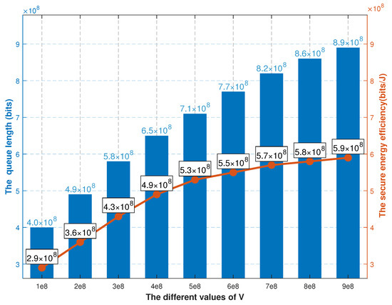 Figure 8 illustrates the relationship between the average user queue length and the system’s average secure EE under different values of the control factor V, where the horizontal axis represents the control factor V, the left vertical axis denotes the average user queue length, and the right vertical axis indicates the system’s average secure EE. The experimental results clearly demonstrate the regulatory effect of the control factor V on system performance, revealing the dynamic trade-off between queue stability and secure EE. Specifically, as the control factor V increases, the average user queue length shows a significant upward trend, while the system’s average secure EE improves simultaneously. The core mechanism behind this phenomenon lies in the fact that the control factor V, as a key parameter in the Lyapunov optimization framework for balancing queue stability and system utility, directly determines the weight allocation of these two objectives in the optimization process: when V takes a small value, the system prioritizes ensuring queue stability, suppressing task backlogs to guarantee service quality, and in this case, the queue length remains at a low level, but the secure EE is mediocre due to limited optimization efforts; when V increases, the weight of the penalty term for secure EE in the system rises significantly, and the optimization objective shifts toward enhancing secure EE— to pursue higher secure transmission efficiency and energy utilization efficiency, the system appropriately relaxes the constraints on queue backlogs, leading to an increase in task accumulation at the user end and thus a rise in the average queue length. Further analysis indicates that the regulatory effect of the control factor V verifies the flexibility of the proposed optimization framework: by adjusting the value of V, refined regulation of queue stability and secure EE can be achieved to meet performance requirements in different scenarios; for instance, in scenarios with high real-time requirements, a smaller V can be selected to prioritize queue stability, while in scenarios sensitive to security and EE, V can be increased to obtain higher secure EE at the cost of partial queue stability. This result fully demonstrates the effectiveness of the control factor V in coordinating the system’s multi-objective optimization, providing important references for parameter configuration in practical applications.