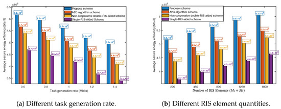 To further explore the impact of other factors on the system’s secure EE, Figure 9 provides quantitative insights through comparative experiments. Figure 9a focuses on the task generation rate (horizontal axis, in Mbits) and average secure EE (vertical axis). Experimental data show that the secure EE of all four schemes (proposed scheme, A2C algorithm scheme, double-RIS non-cooperative scheme, and single-RIS scheme) decreases as the task generation rate increases. Specifically, when the task generation rate ranges from 0.6 Mbits to 1.4 Mbits, the proposed scheme exhibits secure EE values from bits/J to bits/J; the A2C algorithm scheme ranges from bits/J to bits/J; the double-RIS non-cooperative scheme ranges from bits/J to bits/J; and the single-RIS scheme ranges from bits/J to bits/J. Figure 9b examines the effect of RIS element quantity (horizontal axis, total number of ), with results indicating that secure EE increases for all schemes as the number of RIS elements grows. For the proposed scheme, values rise from bits/J to bits/J as elements increase from 200 to 1800; the A2C algorithm scheme ranges from bits/J to bits/J; the double-RIS non-cooperative scheme ranges from bits/J to bits/J; and the single-RIS scheme ranges from bits/J to bits/J. These results highlight the superiority of the proposed scheme: in Figure 9a, it maintains the highest secure EE across all task generation rates, as the PPO algorithm dynamically optimizes resource allocation in continuous action spaces while the enhanced channel gain from double-RIS cooperation ensures stable secure transmission efficiency. In Figure 9b, the proposed scheme achieves the most significant improvement with increasing RIS elements, thanks to its collaborative phase shift optimization that fully leverages hardware potential. Compared to the other three schemes, the proposed approach consistently outperforms, underscoring its robust adaptability to varying environmental factors.