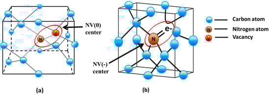 Schematic of (a) NV(0) center and (b) NV(−) center in a diamond unit cell. NV: nitrogen-vacancy.