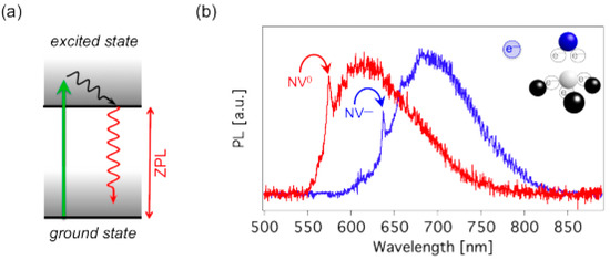 (a) Electronic band structure of an ‘atom-like’ NV center showing the ground state and excited state; (b) Normalized photoluminescence spectra of NV(0) (red) and NV(−) (blue) color centers. The red and the blue spectra elucidate the two peaks associated with the zero phonon line at 575 nm (2.156 eV) and 637 nm (1.945 eV). The solid gray circles in the inset denote the available five electrons in the NV(0) center. The additional trapped electron in the NV(−) center is represented by the dashed blue circle. The white, green and blue spheres denote an N atom, a C atom and a single vacancy site in the diamond lattice, respectively. Adapted from [23].