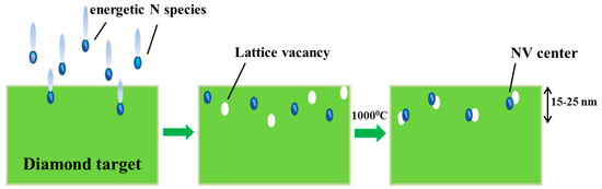 The reaction expressed by Equation (5) requires energy greater than 2.4 eV. This energy might be supplied by an external light source or some other electromagnetic radiation sources. Figure 4 describes the schematic of the generation of NV centers in diamond by ion irradiation and successive annealing.