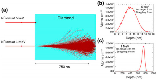 Figure 5 presents the results of Monte Carlo simulations based on the stopping and range of ions in matter (SRIM) simulation software, which illustrates the trajectories of N+ ions implanted into diamond at two different kinetic energies, i.e., at 5 keV and 1 MeV. It clearly shows that the ion straggling increases with ion energy. As a result, low-energy ion implantation is preferred to achieve high spatial resolution in the target matrix, e.g., diamond in this case. Several types of defects, such as vacancies and interstitials are created along the whole ion trajectory, but mostly at the end of range. Indeed, it is short before the ion stops, implying that the interaction with the nuclei of the target reaches a maximum [37].