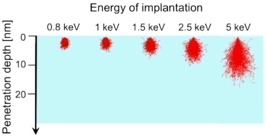 Ion channeling is another effect that may add uncertainty in the depth. Ion channeling can happen in crystalline samples in case the incident direction of an ion beam is aligned with a particular axis of the crystal. The ions can travel through channels between atom rows or planes driven by the interaction between the charged ion and the potential induced by the arrangement of the target atoms. This results in a decrease in the number of collisions and an increase in the implantation depth. Figure 5b,c shows typical simulation results for the depth profiles of nitrogen ions implanted into diamond. The simulations are performed with displacement energy of 28 eV, surface binding energy of 7.4 eV, and lattice binding energy of 3 eV. The deceleration of the ions is due to collisions with electrons (electron stopping) and nuclei of the target atoms (nuclear stopping). The nuclear stopping power dominates for low-energy nitrogen ions implanting onto the diamond target.