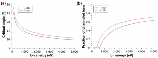 For a particular crystalline axis, only ions incoming within a certain angle can penetrate the channeling rows. This angle is called the critical angle. If the ion velocity is reduced, channeling also does not occur any more below the so-called critical ion energy. Figure 7a shows the critical angle for nitrogen ions into diamond, for (100) and (111) surface orientations. It can be seen that the critical angle becomes very large at low energy. Therefore, a large fraction of channeled ions is expected at these energies, even for high misalignments between the ion beam and the target. For even lower kinetic ion energy, channeling does not occur any more. Thus, a critical angle does not give suitable results [38]. Figure 7b shows the expected fraction of channeled ions in the case of nitrogen in (100) and (111) diamond. It was found that the critical ion energies for channeling are 700 and 400 eV, respectively.