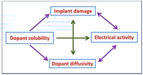In this study, the type of the implant species is fixed, however, the other factors should be analyzed carefully before any experimental endeavor. Incident energy-related damage formation is covered in Section 6.1. Usually during the production of NV centers in diamond, low fluence size (less than ~1014 cm−2) is used [41]. During the low fluence ion implantation the predominant damage type is point defects, i.e., vacancies, interstitials, or clusters of point defects. High dose rate produces extended defects also known as end-of-range defects. A highly detrimental phenomena known as precipitation of the dopants can occur if the dopant concentration reaches the retrograde solid solubility limit [42]. Annealing temperature must be high enough so that the atoms can move in the lattice, although atoms do not require moving large distances. Theoretically, N atoms can find a lattice site within an atomic distance, which is very short in the case of the diamond lattice. In practice, this phenomenon is quite different, because the defects created by implantation enhance the diffusion process. Usually, the annealing treatment is done by keeping the ion implanted samples in a vacuum furnace at a temperature between 800 °C and 1000 °C. Schwartz et al. studied the effect of low-energy electrons on formation of NV centers in low-energy nitrogen ion implantation on single-crystal diamonds [24]. The implanted single crystal diamond was exposed to the low-energy source, which led to the formation of NV centers without any thermal annealing. However, the overall efficiency during this process was low. On the other hand, a dramatic improvement in the efficiency, as high as 1.8 times compared to the thermal annealing alone, was observed when the implanted single crystal diamond was annealed at 8000 °C. The formation of NV-centers by non-thermal reconstruction of nitrogen-vacancy complexes induced by electronic excitations points to an alternative mechanism for NV-center formation versus trapping of a vacancy by a substitutional nitrogen atom. Activation of most of the nitrogen atoms in the diamond lattice is essential, which is attained by the occupation of the N atoms in the substitutional sites. When the dose size is too high (close to or above the retrograde solid solubility limit) the N atoms occupy the interstitial sites. Figure 8 represents the schematic of the interplay model between the damage and doping in the process of the implantation of N ions in diamond lattice.