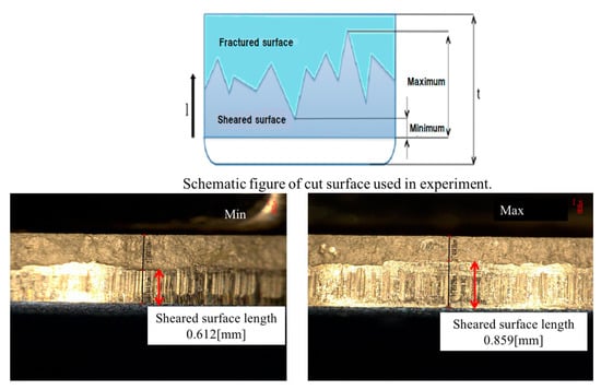 The shear limit point or boundary between the sheared surface and the fracture surface was measured on circular punched samples by using a microscope (VH-Z100, Keyence Headquarters and Lab in Osaka, Japan). The schematic of cut surface used in the experiment, the minimum and maximum sheared surface lengths, respectively, obtained in the experiments are shown in the