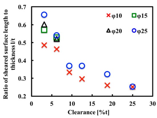 t) as a function of the clearance (percentage thickness (%t)) for different punch diameters. The experiment was performed five times for each clearance value and the results were averaged. With an increase in the clearance (%t), the length of the sheared plane on the cut surface decreased. Furthermore, a shear limit point (