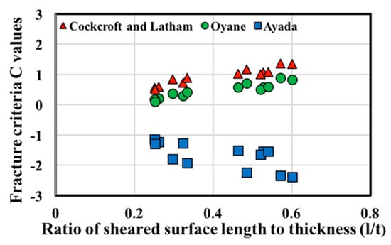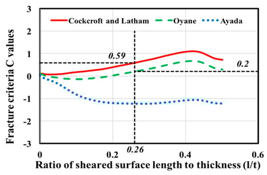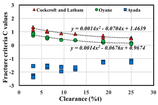 C) obtained from the Ayada model are negative values because of the compressive hydrostatic pressure. The accurate polynomial line fitting to the data (including all result data) was obtained from the Cockcroft–Latham and Oyane criteria. The polynomial line fitting to the data (including all result data) cannot be obtained from the Ayada model as it is based on the Mode 1 tensile crack opening mechanism, but the Cockcroft-Latham criterion performs well as it is the criterion based on a hidden out-of-plane shear based condition [