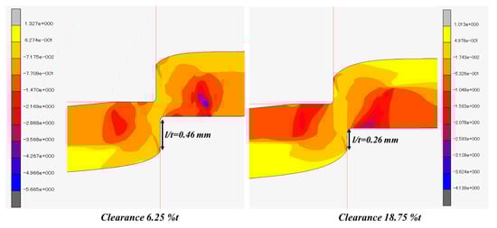 The comparison of the distribution of stress triaxiality at the fracture initiation point (shear limit point) for the blank thickness of 1.6 mm, punch diameter 10 mm, and clearances of 6.25 %t and 18.75 %t is shown in