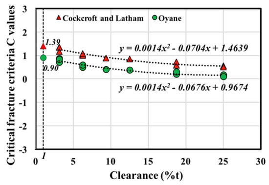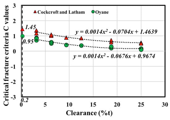 C) of Cockcroft-Latham and Oyane were calculated for different clearances and these values were used to predict the shear surface length (