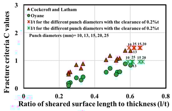 The sheared surface lengths of material thicknesses of 1.6 mm for clearances of 1 %t and 0.2 %t with the different punch diameters (10, 13, 15, 20, and 25 mm) were also predicted by using the values of the critical fracture criteria obtained from the Cockcroft–Latham and Oyane models. The values of the critical ductile fracture criteria (
