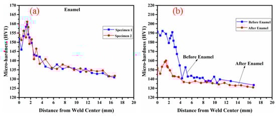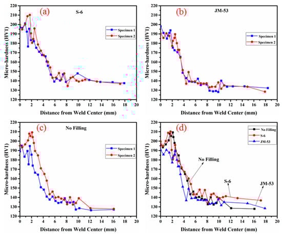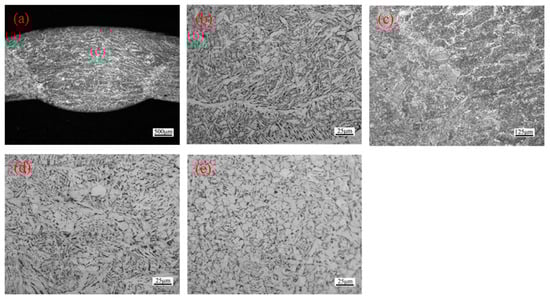 21]. It was found that the micro-hardness of the joint is about 350 HV1 and fluctuates slightly along the weld across section, which is two times higher than that of base materials (it is about 180 HV1) that are caused by the formation of lath martensite. The tensile strength of the joint with full penetration is better than the dissimilar metals.