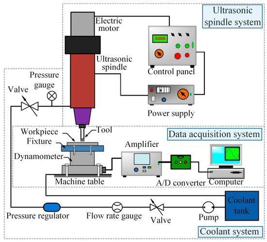 The experiments were conducted on a rotary ultrasonic machine (Series 10, Sonic-Mill, Albuquerque, NM, USA). As illustrated in Figure 2, rotary ultrasonic machining set-up mainly consisted of an ultrasonic spindle system, a coolant system, and a data acquisition system. The ultrasonic spindle, a power supply, an electric motor, a control panel, and a hydraulic feeding device (not shown in the figure) comprised the ultrasonic spindle system. The power supply converted electrical input of 110 V and 50–60 Hz signal in to 20,000 Hz electrical signal which fed to a piezoelectric device that located at inside of the ultrasonic spindle. Then piezoelectric device converted 20,000 Hz signal into high frequency mechanical vibration, namely ultrasonic vibration. That low amplitude ultrasonic vibration was amplified by the acoustic horn located in the ultrasonic spindle and delivered to the cutting tool. Amplitude of the vibration is mainly depending on the output level of the power supply. Rotation of the spindle was provided by the electric motor located on top of the spindle. The coolant system included a coolant tank, a pump, valves, flowrate and pressure gauges, and pressure regulators. The data acquisition system contained a dynamometer (Model 9272, Kistler Inc., Winterthur, Switzerland), a charge amplifier (Model 5070, Kistler Inc., Winterthur, Switzerland), an analog to digital converter, a data acquisition card (PC-CARD-DAS16/16), and a computer with software (Type 2815A, Kistler Inc., Winterthur, Switzerland).