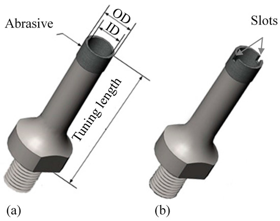 Experiments were conducted using metal-bonded diamond core drills as illustrated in Figure 3. Figure 3a shows a metal-bonded diamond cutting tool without slots for continuous RUM, and Figure 3b shows a slotted metal-bonded diamond cutting tool for intermittent RUM. Their outer and inner diameters (OD and ID) were 9 mm and 7 mm, respectively. Four input variables (cutting tool: intermittent and continuous, ultrasonic power, tool rotation speed, and feedrate) were studied during the experiment and the experimental design is shown in Table 2. Ultrasonic power was presented as the percentage at ultrasonic power supply.