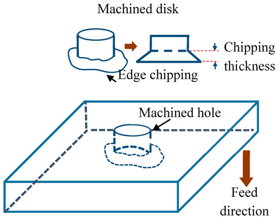 Figure 4 illustrates the edge chipping in RUM of K9 glass. RUM uses core drill as the tool, so drilling a hole also produces a cylindrical disk-shape core at the same time and the core is addressed as the machined disk. Edge chipping thickness was measured on the machined disk by using a microscope (Model BX51M Olympus Inc., Tokyo, Japan) as illustrated in Figure 5. The microscope has high resolving power along its longitudinal axis, referred as depth of focus (DOF). Based on DOF, edge chipping thickness was measured with the assistance of fine-adjustment of the microscope. The K9 machined disc was placed flat on the adjustable table of the microscope, then the fluorescent lamp was turned on. The corresponding reading of the fine adjustment was noted down after focused on the edge of the exit surface. According to the same procedure, the reading of the fine adjustment was taken after focus on the uppermost surface of the chipping area. Edge chip thickness was calculated by the difference of the two readings on the fine adjustment.