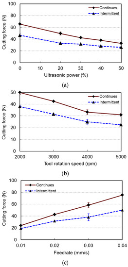 Cutting force is one of the main output variables, since it is associated with tool wear, cutting temperature, surface roughness, and torque [21,22]. Figure 6a shows a comparison of cutting force between intermittent and continuous RUM. Figure 6 presents the average value of the cutting force of three holes drilled on K9 glass under the same condition. It can be seen that cutting force of intermittent RUM was always lower than that of continuous RUM. However, previous intermittent RUM study of alumina reported that cutting force has no significant difference compared with cutting force of continuous RUM [18].