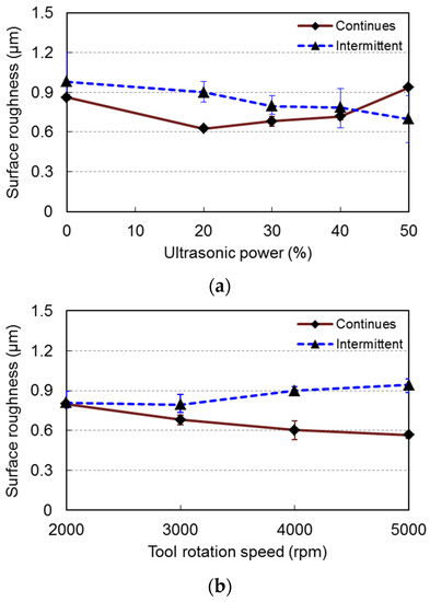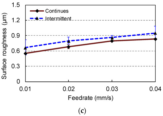 As shown in Figure 7a, in continuous RUM, the lowest and the highest surface roughness were obtained at 20% and 50% ultrasonic power, respectively. According to Figure 7b, surface roughness of continuous RUM decreased as tool rotation speed increased. However, surface roughness of intermittent RUM increased with the increase of tool rotation speed beyond 3000 rpm. The difference in surface roughness between intermittent RUM and continuous RUM was enlarged as tool rotation speed increased. It can be seen from Figure 7c, for both intermittent and continuous RUM, surface roughness increased with the increase of feedrate. The difference in surface roughness between intermittent RUM and continuous RUM did not change much as feedrate increased.
