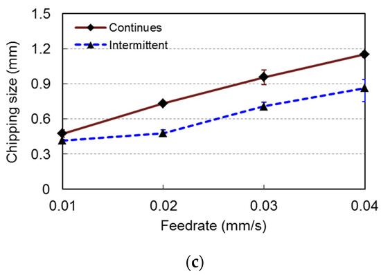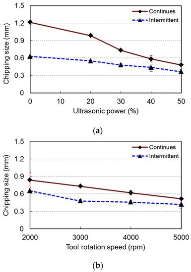 A comparison of edge chipping size between the two types of RUM is shown in Figure 8. According to Figure 8, the chipping size of intermittent RUM was smaller than that of continuous RUM. The chipping size decreased as ultrasonic power increased for both continuous and intermittent RUM. The difference in chipping size was larger at lower ultrasonic power levels. According to Figure 8b, chipping size decreased with the increase of tool rotation speed for both RUM. The lowest chipping size was obtained for intermittent RUM at the tool rotation speed of 3000 rpm. As shown in Figure 8c, chipping size increased as feedrate increased. The difference in chipping size between intermittent RUM and continuous RUM did not change much as feedrate increased beyond 0.02 mm/s.