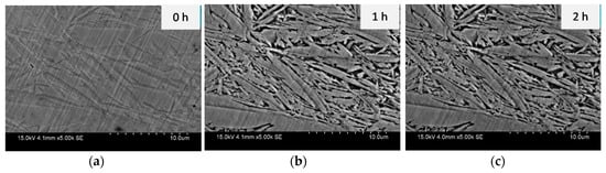 The microstructure of the slightly etched sample is shown in Figure 1; at t = 0 h, a dual-phase morphology is visible under SEM analysis, the light grey area in Figure 1a is martensite phase and the dark grey area is austenite. In order to see different phases for starting samples at t = 0 h, the samples were etched using a 2% nital solution. The sample was immersed in the corrosive solution for up to one hour, and the results revealed a preferential attack on the austenite phase as its microstructure was corroded more than martensitic phase, the black phase in Figure 1b,c is corroded austenite phase, and the grey area is the martensite phase. This phenomenon, in which the martensite was able to resist the sodium chloride attack and damage was confined to the retained austenite phase, occurred up until two hours of immersion. This means that the martensite phase was more stable in the face of corrosion attack over this time period, as the amount of carbon present in the martensitic phase is higher than in the retained austenitic phase [].