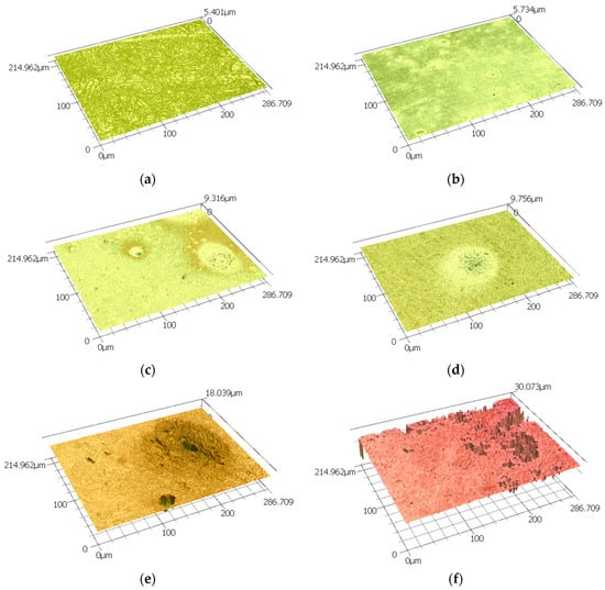 A group of 3D images of the sample surface form 3D LSCM data after (a) 0 h, (b) 1 h, (c) 2 h, (d) 6 h, (e) 12 h, (f) 24 h and (g) 48 h of exposure to 0.5 M NaCl media.