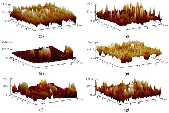 Three-dimensional AFM topographic imaging of the steel surface after (a) 0 h, (b) 1 h, (c) 2 h, (d) 6 h, (e) 12 h, (f) 24 h and (g) 48 h of exposure to 0.5 M NaCl media.