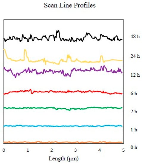 An insight into the corrosion at the nano-scale was obtained, as indicated in Figure 5. This shows the different AFM topography images of high carbon steel’s surface from 0 h to 48 h following immersion in the 0.5 M NaCl media. The seven three-dimensional high-reconstruction mappings shown in Figure 5 include quantitative data that is useful in tracking the evolution of the sample’s surface. Figure 5a represents the scan (t = 0 h) before contact with NaCl solution; as grain structures and polishing scratches were clearly observable, it was clear that the steel surface had not yet been transformed or modified by the corrosive solution. In Figure 5b, when t = 1 h, the original scratches were barely visible, and the steel surface’s had become coarser, as the austenite phase had started to corrode. By contrast, the martensite stayed intact and epitaxial oxides grew on the rougher area. The continuous corrosion attack was responsible for the unique appearance of the surface, as the original phase of austenite began to collapse, generating more pitting holes, and the martensite phase started to deteriorate; see Figure 5c. After the first two hours of the experiment, more of the austenite phase was consumed, causing an increase in surface roughness, as shown in Figure 5d. Both austenite and martensite were corroded, and a more uniform surface roughness was generated by around t = 12 h. This cyclical process continued until t = 48 h. The different topographies of the dual-phase high carbon steel are shown in Figure 5e–g. The AFM image offers more precise details, as well as various useful quantitative information, e.g., roughness average (Ra), root mean square roughness (Rq), and average maximum height of the profile (Rz). This valuable quantitative data regarding the evolution of the surface of the steel is summarised in the profiles of the line scans of each topography image, as presented in Figure 6, with a uniform gap to prevent redundant overlapping.