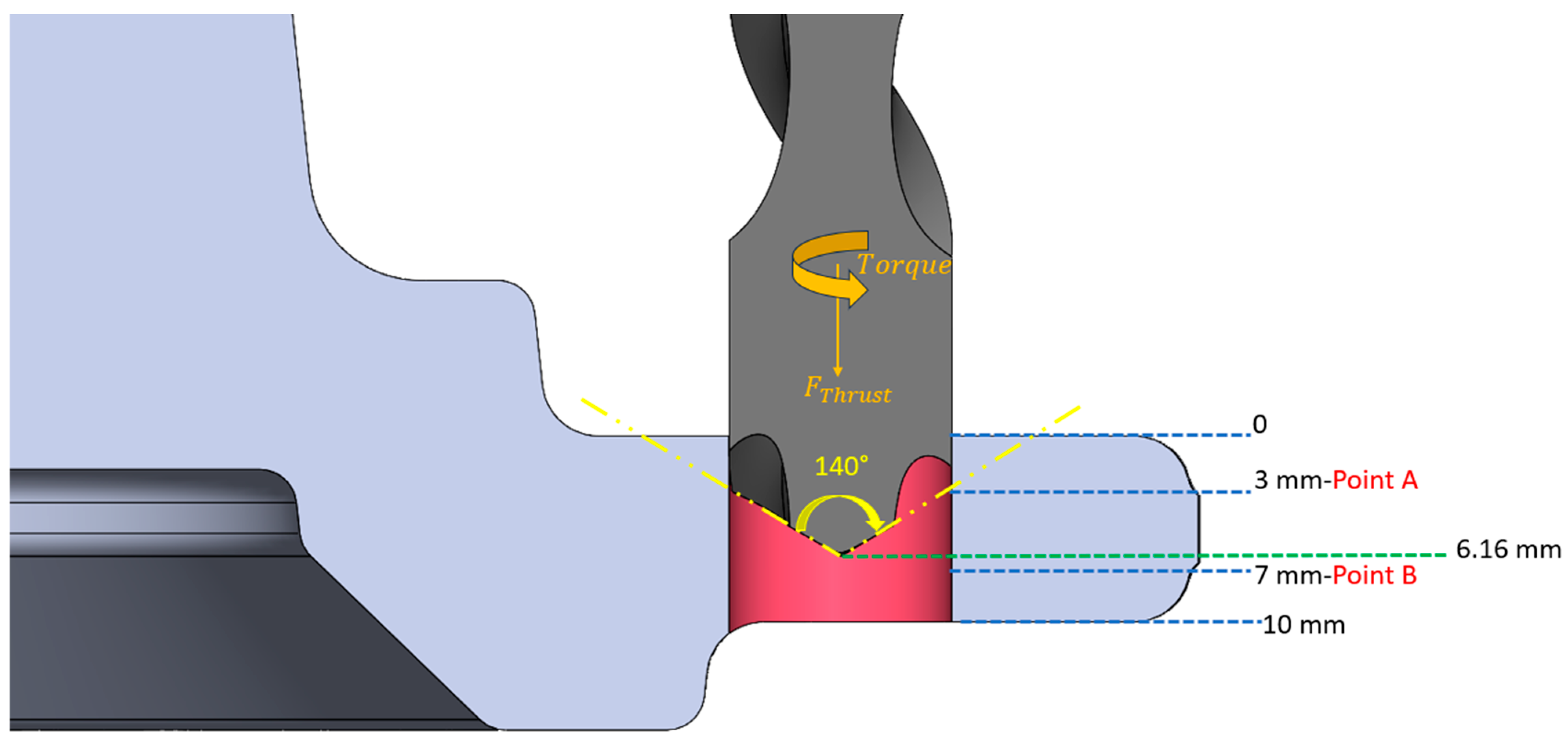 - Luo, H.; Fu, J.; Wu, T.; Chen, N.; Li, H. Numerical simulation and experimental study on the drilling process of 7075-T6 aerospace aluminum alloy. Materials 2021, 14, 553. [Google Scholar] [CrossRef]