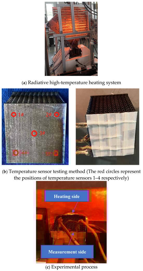 The radiation heating system setup is shown in Figure 2a, the sensor attachment method is shown in Figure 2b, and the heating test process is depicted in Figure 2c. The lattice sandwich structure consists of upper and lower panels with a lattice core in the middle. Five temperature sensors, ranging from −200 °C to +1200 °C, were attached to one side of the lattice structure, while the other side was subjected to radiant heating, using high-temperature insulating wool to block radiant heat from heating the other four surfaces. The test temperature was set to 800 °C. Once the temperature of the heated side reached 800 °C, it was maintained, and the temperature changes on the other side were measured. The patch type PT100 temperature sensors are used for measuring temperature.