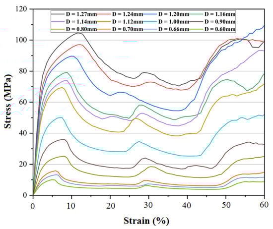 Figure 5 shows the portion of the simulation calculation process. As the compression process progresses, the elements near the upper and lower pressure plates of the lattice structure undergo deformation first, and stress concentration occurs near the strut nodes. The local maximum stress reaches 2216.2 MPa as the lattice structure is gradually compacted. Extract the total force and area of the upper and lower pressure plates and calculate the macroscopic stress–strain curve of the lattice structure as shown in Figure 6. It can be observed that during the middle stage of compression, the stress of the lattice structure exhibited a distinct plateau. This is consistent with the typical characteristic of a plateau stress in porous materials with low relative densities. Under external loads, the porous structure underwent localized instability and collapse, forming a deformation zone. This deformation zone gradually expanded to encompass the entire structure under constant stress. This compression characteristic endowed the material with excellent properties such as impact resistance and energy absorption. As the strut diameter of the lattice structure increased, the plateau stress of the diamond lattice structure also increased. When the strut diameter was 0.66 mm, the plateau stress was approximately 7 MPa. When the strut diameter reached 0.9 mm, the plateau stress was approximately 22 MPa. When the strut diameter was 1.12 mm, the plateau stress was approximately 47 MPa. When the strut diameter reached 1.2 mm, the plateau stress was approximately 62 MPa.