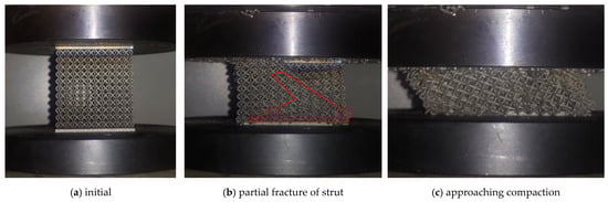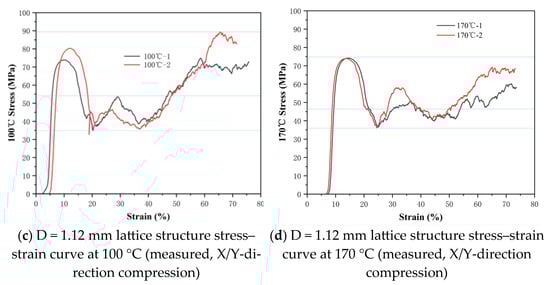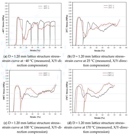 The quasi-static compression test was carried out on a microcomputer-controlled electronic universal testing machine (10 t). The compression test was conducted along the X/Y direction (as shown vertically to the plane of the study in Figure 1). The lattice structure was fixed on the lower plateau. The upper plateau moved downward at a speed of 0.05 mm/min. The compression process is shown in Figure 2. It is worth mentioning that all these structures exhibited varying degrees of anisotropy. Preliminary compression tests revealed that compressing along the Z direction resulted in significant fluctuations in the stress–strain curve, making the compression process unstable. Therefore, the focus is on studying the compression performance in the X/Y directions. The quasi-static compression tests were conducted on the lattice structure at different environmental temperatures of −40 °C, 25 °C, 100 °C, and 170 °C. The strut diameters of the lattice structure were 0.66 mm, 0.9 mm, 1.12 mm, and 1.2 mm, respectively. High-temperature compression performance tests (at 100 °C and 170 °C) were conducted using a radiation heating furnace. The constant temperature zone of the furnace is at least twice the length of the sample. The furnace space does not hinder temperature measurement. The measured temperature and the specified temperature deviation are less than or equal to ±3 °C. Low-temperature compression performance tests were conducted in an unheated furnace. Liquid nitrogen was sprayed inside the furnace for cooling, ensuring an internal temperature of −40 °C ± 5 °C. After the workpiece reached the set temperature range, it was stabilized for 5 min before conducting the quasi-static compression test.