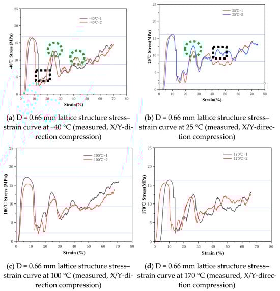 Stress–strain curves of the D = 0.66 mm lattice structure at different temperatures.