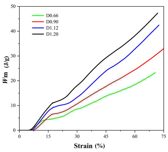 The mean Wm of lattice structures with different strut diameters is shown in Figure 13. As the deformation increases, the energy absorption of the lattice structure gradually increases. And as the diameter of the lattice structure rod increases, its energy absorption also gradually increases. This is because during the compression process, the lattice structure gradually undergoes elastic deformation, plastic deformation, fracture, and friction, thereby continuously dissipating energy. The larger the rod diameter, the greater the energy consumption due to failure, and the greater the energy absorption per unit mass. Therefore, when weight allows, larger strut diameters should be used as much as possible to increase energy absorption performance.