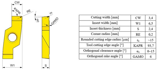 The indexable inserts, originally designed for circlip grooving, were made of uncoated Dormer Pramet H07 (Prague, Czech Republic) solid carbide submicron grade and were sourced from a single production batch. According to the manufacturer, this grade is designed for fine to medium machining of titanium alloys and non-ferrous metals, thanks to high resistance to wear and a stable cutting edge [37]. The blank inserts were ground to the required in-hand geometry (see Figure 4), featuring variable clearance angles according to the central composite design described below.