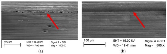 After grinding, all inserts were drag-finished in an OTEC DF3 (OTEC Präzisionsfinish GmbH, Straubenhardt-Conweiler, Germany) system with HSC 1/300 granulate to eliminate burrs, homogenise the ground surfaces, and achieve a consistent cutting-edge radius. The influence of the drag finishing process is considerable on the SEM image in Figure 5 where the red arrows point to the state of the cutting edge before and after drag finishing. The target cutting-edge radius was 15 ± 3 µm. The cutting-edge radius (rn) was measured on the linear section of every indexable insert before use, employing a Bruker Alicona InfiniteFocus G6 (Bruker Austria GmbH, Graz, Austria) system via Focus Variation Microscopy (FVM). The measurements indicated a mean rn of 16.6 µm with a standard deviation of 0.43 µm. As this variation is significantly narrower than the tolerance 3 µm, rn was treated as a random factor in the statistical analysis, with minor fluctuations incorporated into the regression model’s error term.
