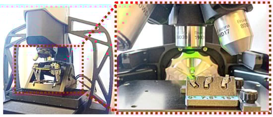 During pre-experiments, typical tool flank wear VB was not observed, and there was a presumption that the type of tool wear can be variable, as cutting conditions are also variable according to experiment design. However, for statistical evaluation, it is essential to observe one response. Therefore, volumetric loss of the insert material was evaluated. Every unworn insert was scanned on an Alicona Focus Variation Microscope (FVM) (Graz, Austria) (see Figure 6) to obtain a reference dataset of topographies for 3D volume wear evaluation. After every test trial, the insert was cleaned to remove dirt and then measured. Then, the alignment of the unworn and worn insert was performed, and a difference analysis was executed to evaluate wear progression. Volume of valley defects extending below the tolerance (Vdv) parameter was observed, as it is suitable for crater and flank wear observation if proper fixing is ensured.