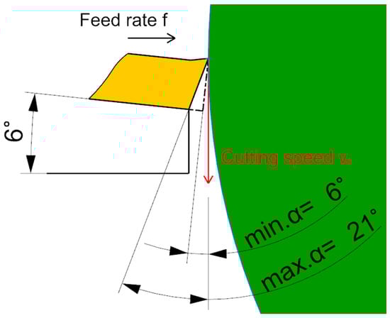 Insert clearance angle as a controlled geometry factor, and the cutting speed and feed rate as technological factors were held as variable factors. The cutting speed was selected based on the tool manufacturer’s recommendations and further adjusted through pre-experiments to ensure process stability. The feed rate was selected in accordance with the tool manufacturer’s guidelines. The lower limit of the clearance angle was set based on the minimum value commonly applied in standard cutting tools, whereas the upper limit was defined through pre-experiments to determine a feasible operational range without compromising the tools’ integrity. Table 3 shows variable factors and their coded and actual limit values. The rest of the tool geometry and technological factors were kept constant, as shown in Table 3, except for the wedge angle, which varies according to the clearance angle. The depth of cut was set at a constant value of ap = 0.5 mm, and revolutions were continuously adjusted in accordance with a constant cutting speed. The scheme of the cutting situation is illustrated in Figure 7.