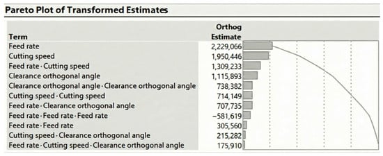 From the statistical evaluation of the experimental results, represented by the Pareto chart (Figure 8), the most influential factors and interactions affecting the process can be identified. The Pareto plot displays the absolute magnitudes of the effects. The tool wear response Vdv is primarily driven by the feed rate and cutting speed, with a substantial contribution from their interaction. The clearance orthogonal angle also exhibits a notable effect. In addition, several higher-order terms demonstrate measurable influence, indicating non-linear and coupled wear mechanisms. Incorporating these terms enhances the accuracy and robustness of the response surface model under varying cutting and geometric conditions.