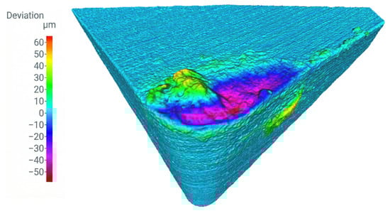 Figure 9 presents the visual-difference map derived from the 3D scan of the representative insert. This representation enables direct determination of the Vdv tool-wear parameter, localisation of the wear region, and continuous volumetric assessment of the removed material. The maximal crater depth is situated in the purple region near the cutting edge. The topography also reveals added material on both rake face and flank face of the tool, which was investigated below. The crater is around 50 µm deep, and the adhesion layer is more than 40 µm high.