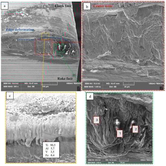 Figure 10c shows the boundary region between the rake and flank faces at 2000× magnification. The orientation of the smeared layers follows the direction of the cutting speed, confirming abrasive interaction with the machined surface. EDS analysis in this region revealed high concentrations of titanium along with aluminium and vanadium, indicating the presence of adhered workpiece material. Beyond the boundary of this adhered layer, no typical flank wear pattern was identified on the insert.