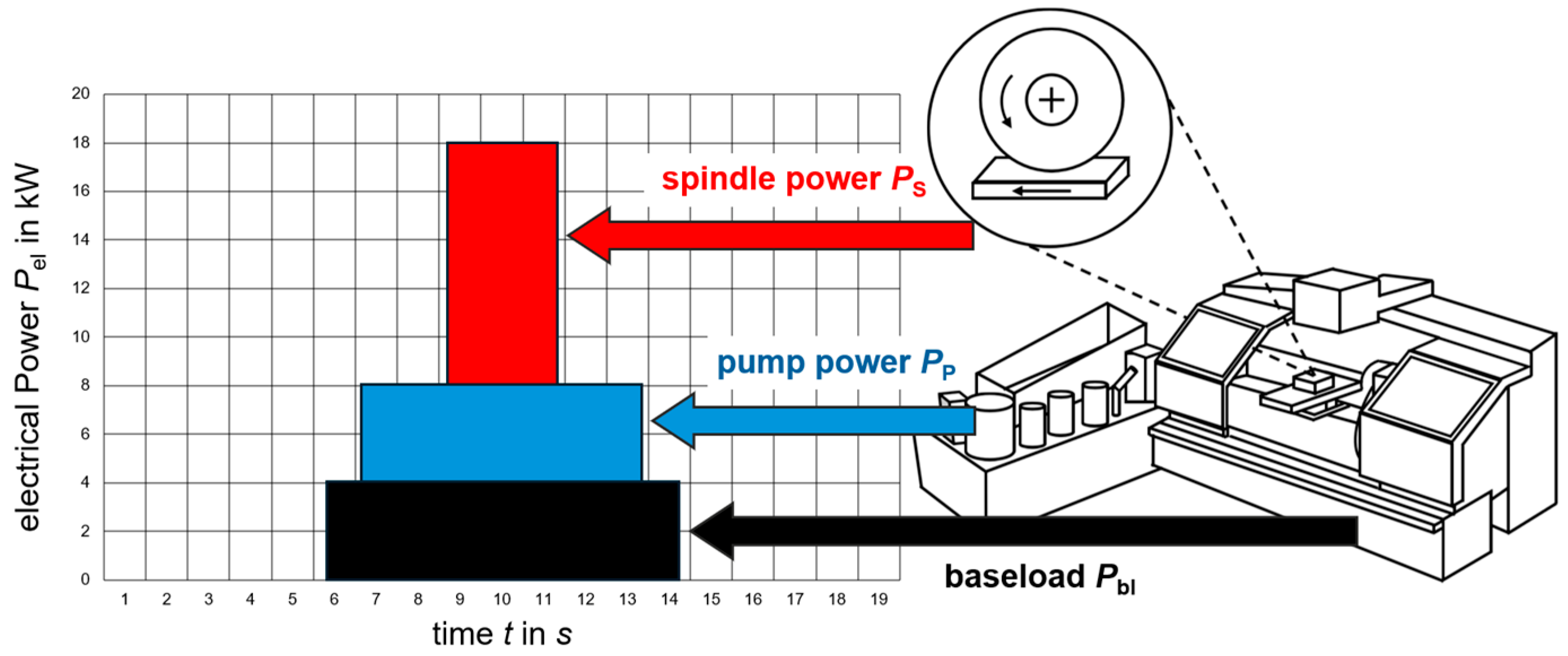 Pbl (fundamental energy demand for hydraulics, etc.) of the grinding machine, the electrical energy which is converted into kinetic energy (rotational motion of the spindle with partial power